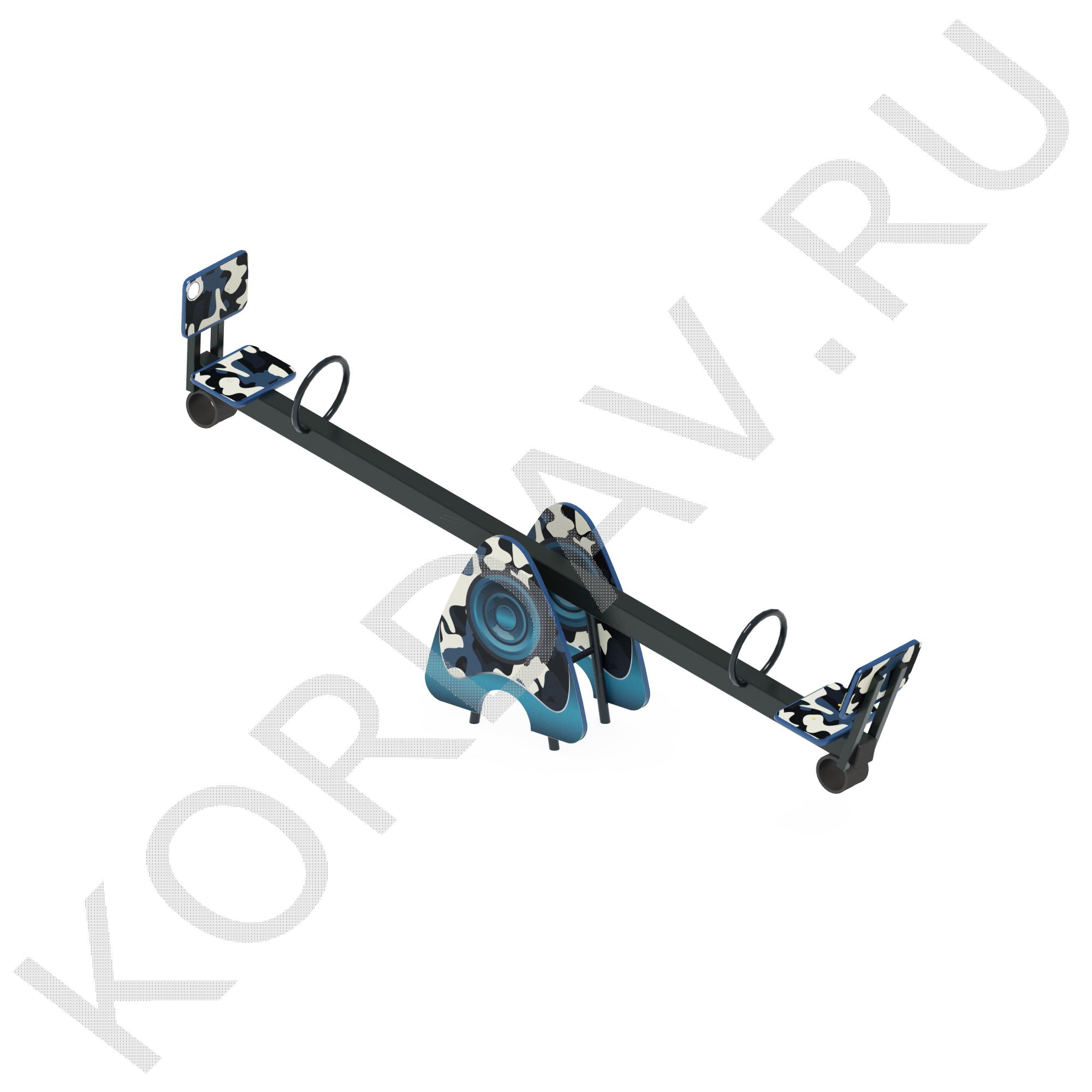 Балансир: Состоит из квадратной профильной трубы сечения 80х80 мм с толщиной стенки 3 мм. К основе балансира приварены квадратный стальной фланец размером 150х150х4 мм; два крепления спинки, сделанные из квадратной профильной трубы сечения 30х30 мм с толщиной стенки 2 мм; две круглые ручки, сделанные из круглой трубы наружным диаметром 21 мм и две стальные пластины для крепления амортизатора. Размер балансира: 3020х320х360 мм. 1 шт